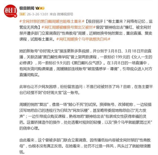 据3月26日报道,曾以一句“眼神给出去”爆红网络、随后因内容低俗和售卖高价课程被全网封禁、遭多部门立案调查的“性商教母”周媛,最近又有了新动静——她并未消失,而是换了个“马甲”,试图在网上悄然重启她的“生意”。