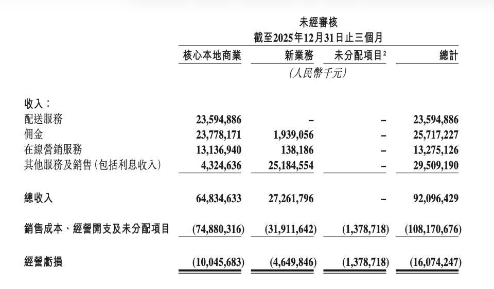 全年看,利润由盈转亏背后,最突出的变量是销售及营销开支从640亿元增至1029亿元,同比增长60.9%;其中推广、广告及用户激励从391亿元增至745亿元。与此同时,销售成本由2078亿元增至2538亿元,同比增长22.2%;核心本地商业从2024年的经营溢利524亿元转为2025年的经营亏损69亿元。